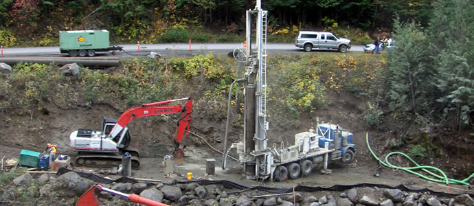 Johnston Construction has expanded its Foundation Construction services to provide state of the art drilling and caisson installation equipment for shallow, mid and deep foundations. Through the use of down the hole (DTH) percussion hammers, Johnston Construction is capable of installing caissons from 150mm to 610mm diameter. The system drills and installs the caisson in a single pass eliminating the need to case the hole before drilling, regardless of the geological formation to be drilled. The methods that Johnston Construction utilizes also allows caissons to be drilled at a batter, though boulder laden overburden, or consolidated bedrock with remarkable speed and accuracy.